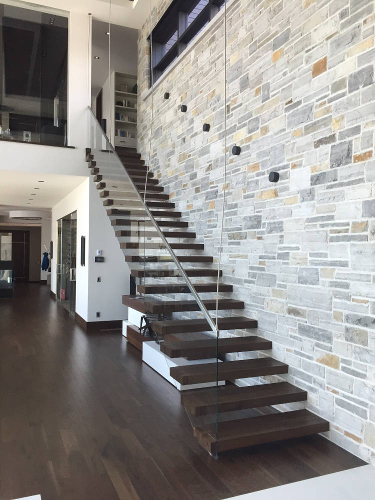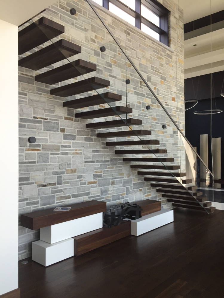 Mounted to one wall. No visible structure or hardware, providing the look of true floating stairs. With the addition of end caps which cover the glass standoff hardware, the only visibile elements here are glass, box treads and your choice of rail.