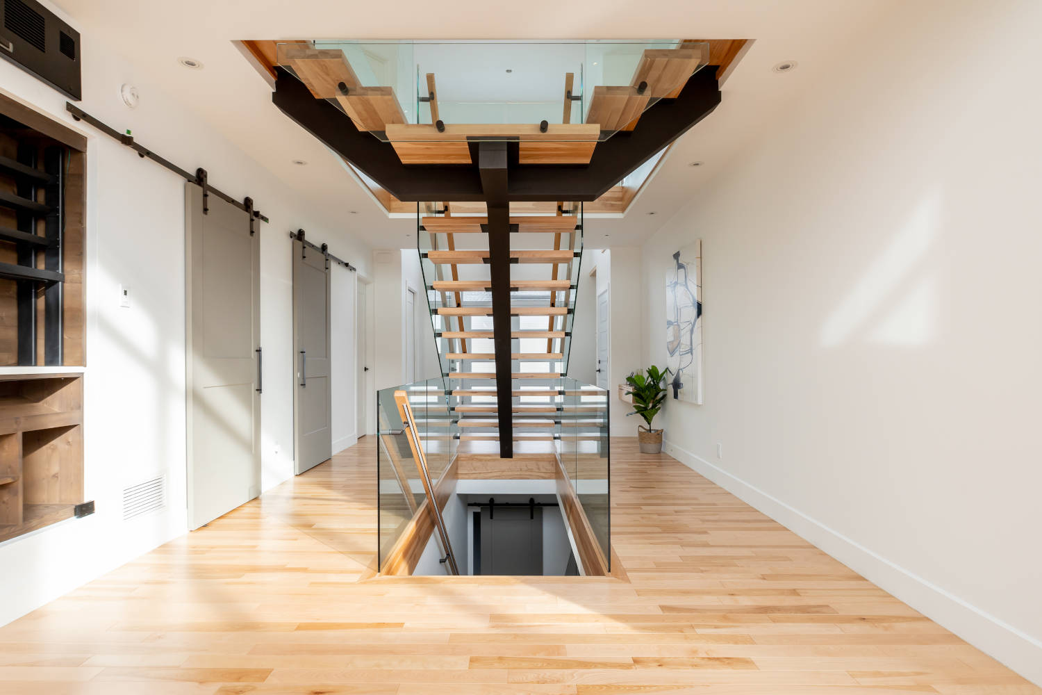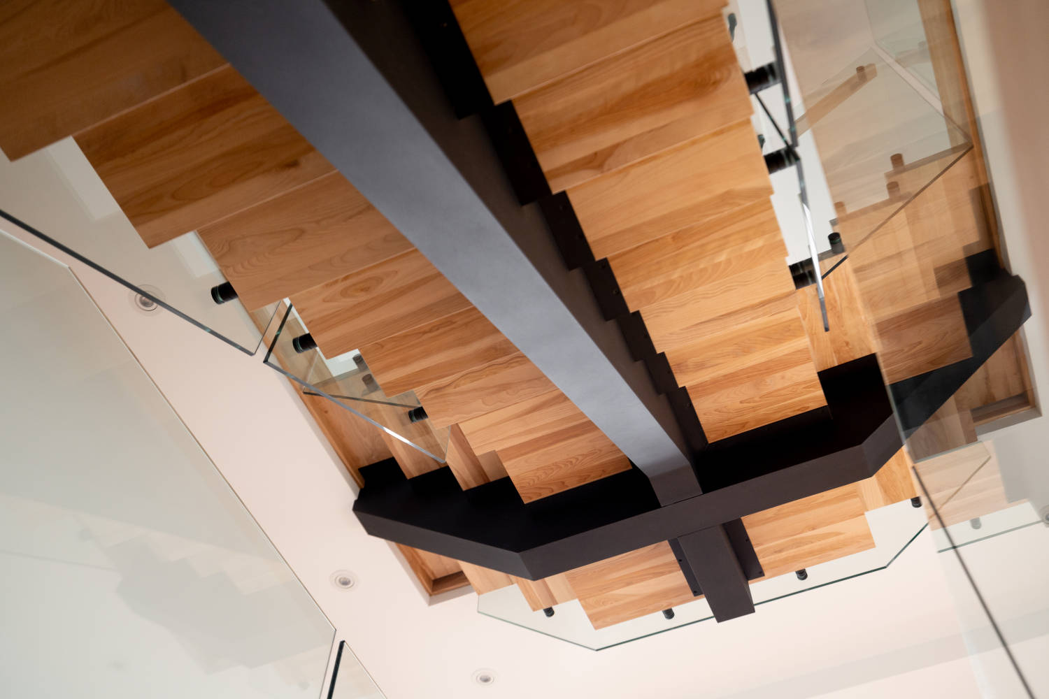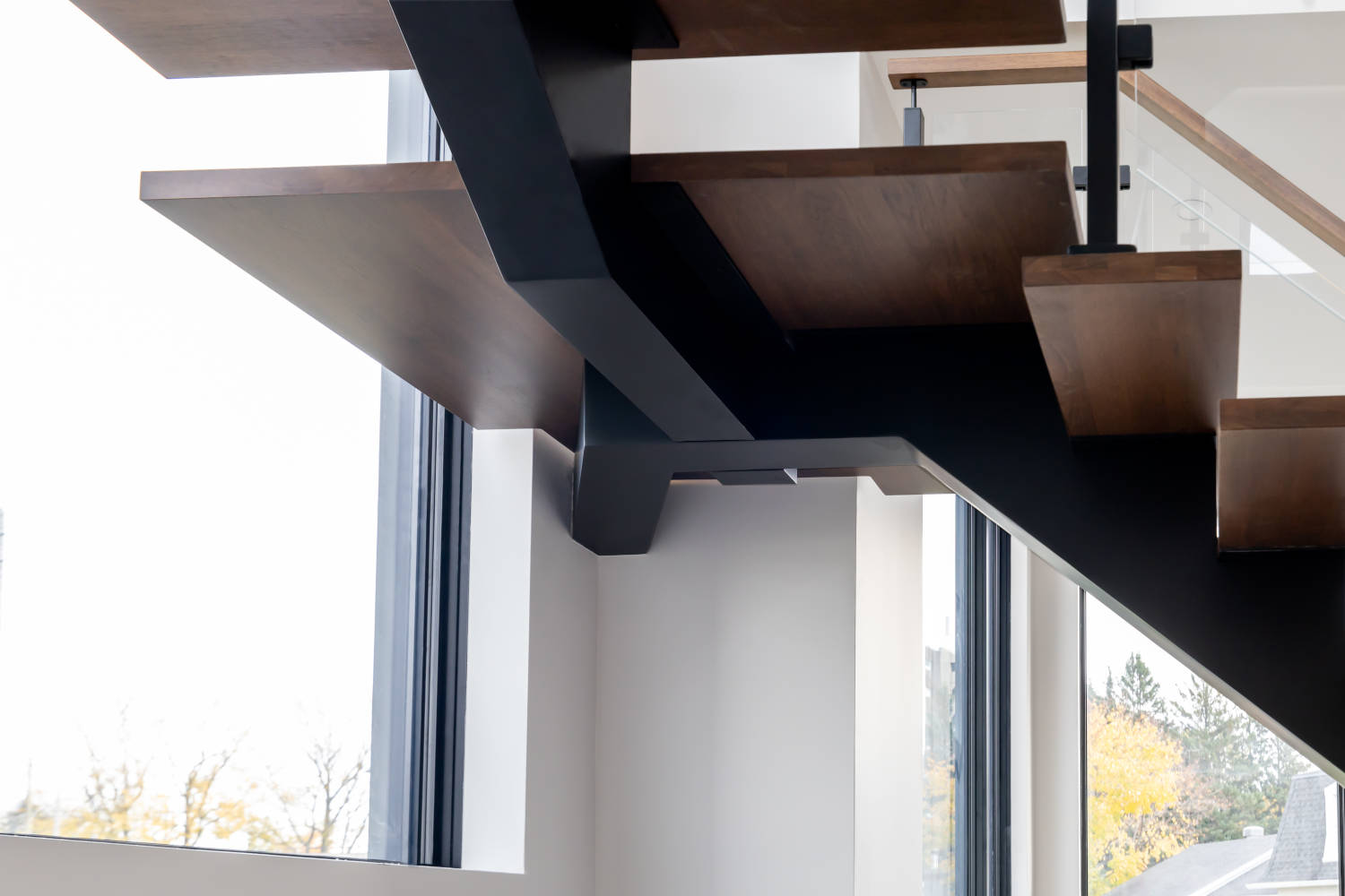The Paris utilizes a central mono stringer with a hardware bracket that is visible but seamless with the stringer. These provide a clean, balanced and contemporary look and can be paired with any configuration of wood or metal handrails and post or standoff glass.