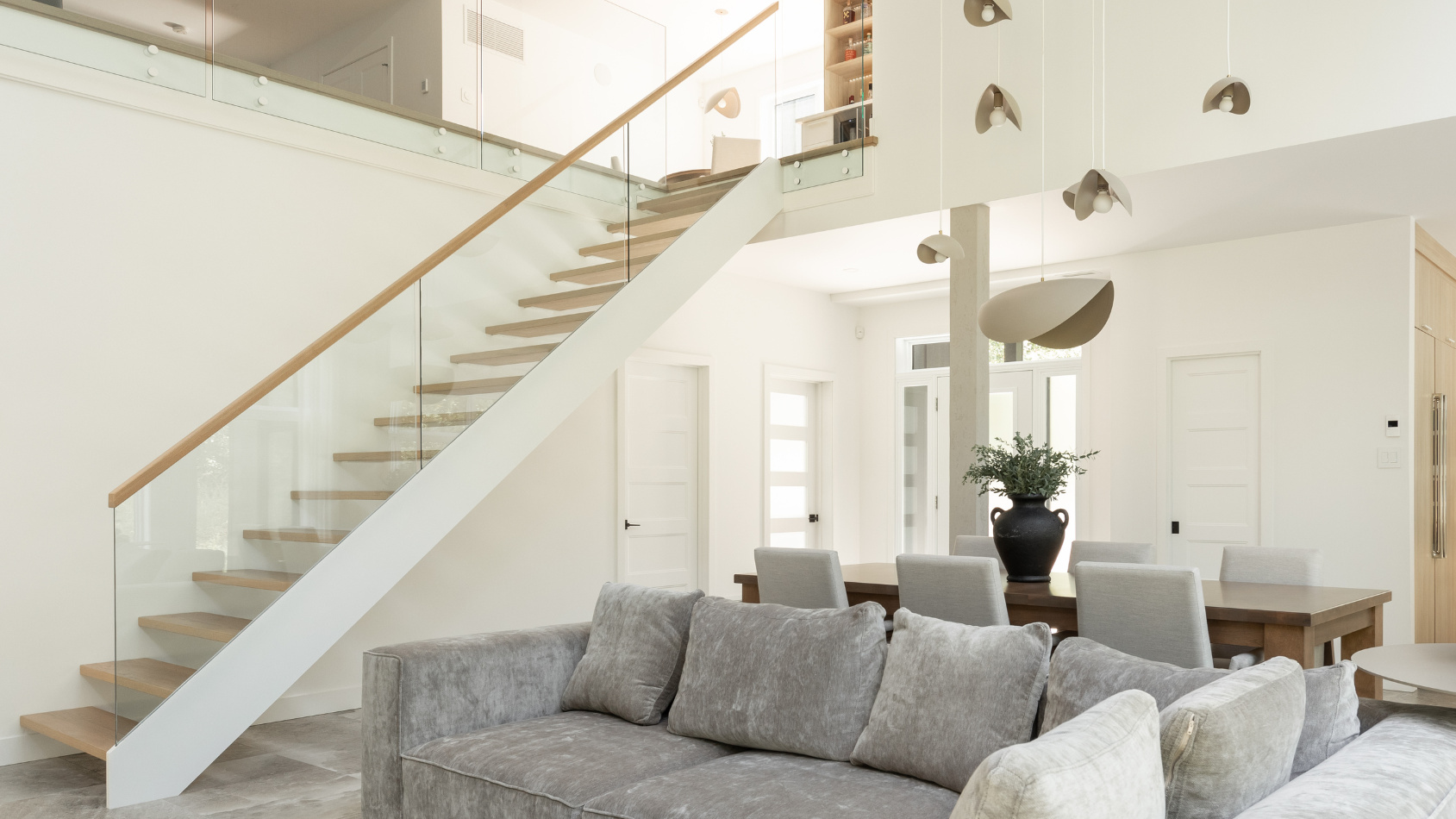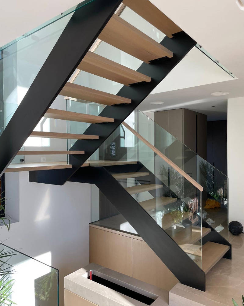 Similar to the Chicago design, an additional stringer is added to the free floating side of the staircase. This addition provides a slotted track to receive a glass guardrail as desired. Due to the additional stringer, this staircase can be positioned anywhere in a home independent of a supporting wall.