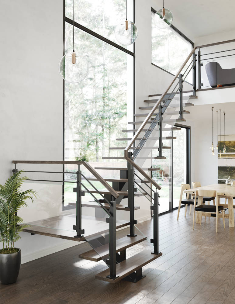 A central mono stringer with a unique vertical step support. These can be paired with any configuration of wood or metal handrails and post or standoff glass.